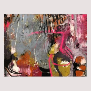 When I added the grey to simplify the middle of this piece everything began to fall into place. I love the way that the grey makes the other colors sing, especially the pink line. But, my favorite part of this piece are the streaky scrapes in the brown areas at the bottom left and right.